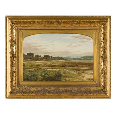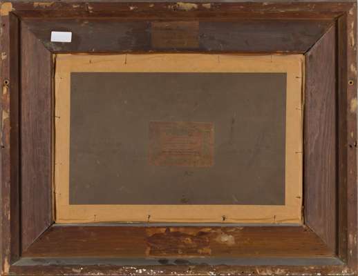 Signed, inscribed with artist's address on label verso, oil on board, arched top