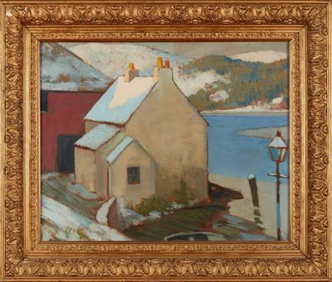 This painting shows the view looking south-west over the River Dee from Kirkcudbright Harbour, including Shore House on the left.