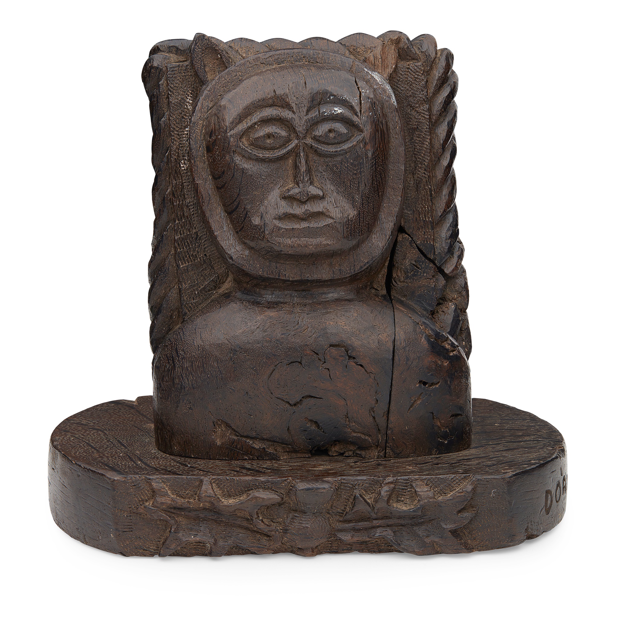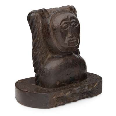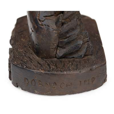 modelled in wood torrefaction, most likely carved from the remains of the 1570 fire of Dornoch Cathedral, to a later plinth engraved DORNOCH IMP