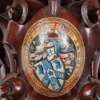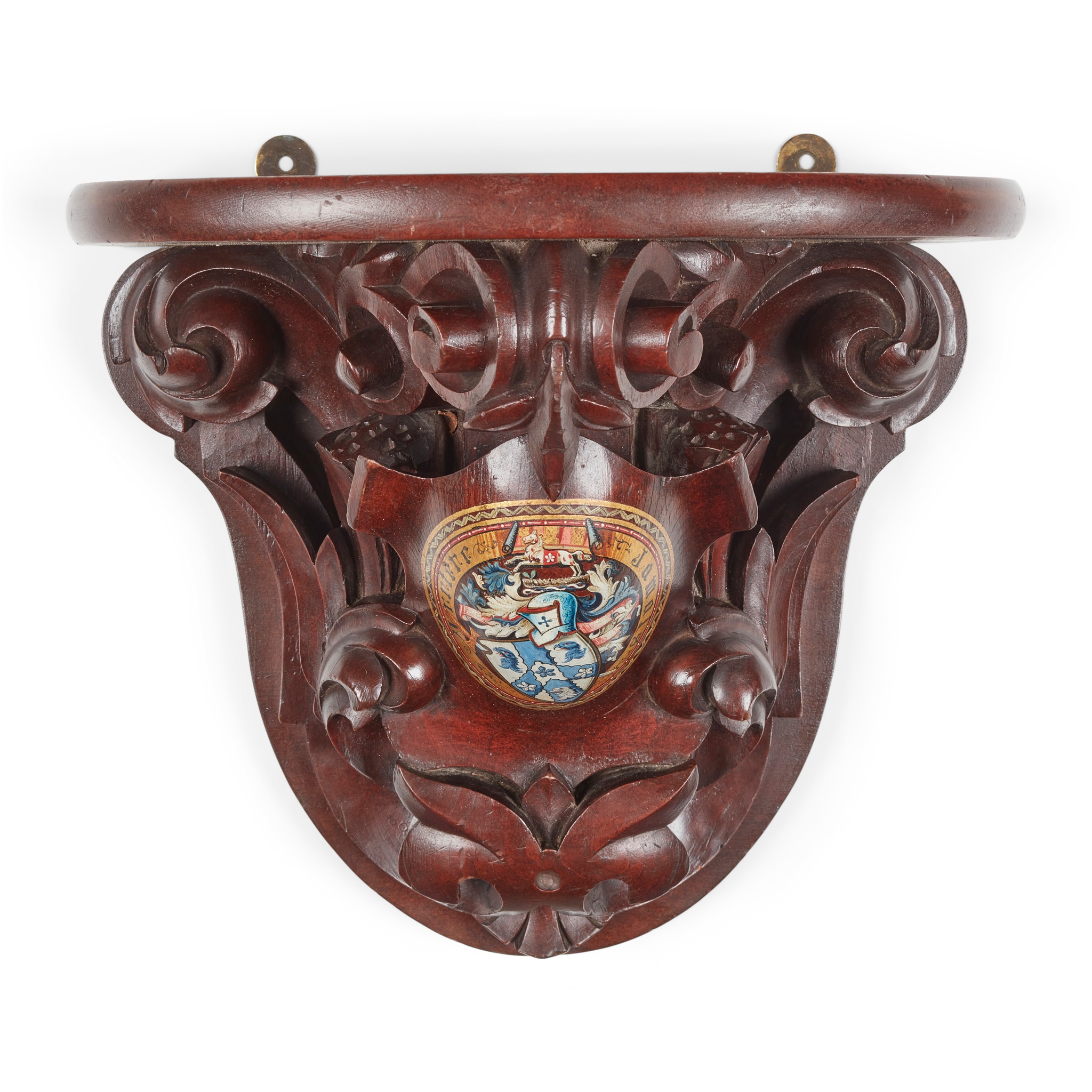 A CARVED MAHOGANY AND POLYCHROMED ARMORIAL WALL BRACKET
