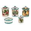 comprising THREE LARGE PRESERVE JARS & COVERS in 'Cherries', 'Oranges' and 'Brambles' patterns, various impressed, painted and printed marks, each 12.5cm high; a SMALL PRESERVE JAR & COVER in 'Raspberries' pattern, Bovey Tracey period, painted WEMYSS WARE, printed MADE IN ENGLAND, 7.5cm high; and a LOW POMADE & COVER in 'Shamrocks' pattern, impressed WEMYSS WARE, 4.2cm high