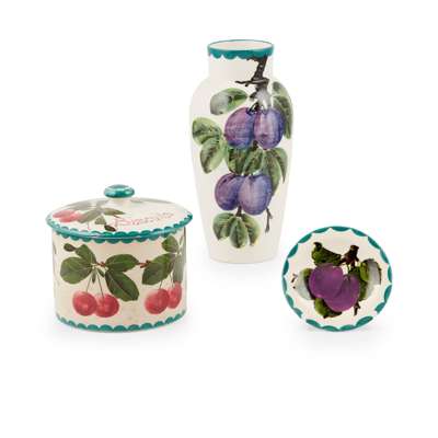 impressed WEMYSS, printed retailer's stamp T. GOODE & CO., 20cm high; together with a 'CHERRIES' BISCUIT BARREL & COVER, painted and impressed WEMYSS, printed retailer's stamp T. GOODE & CO., 12.5cm high