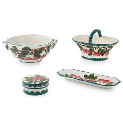 comprising a LOW POMADE, impressed WEMYSS, printed retailer's stamp T. GOODE & CO., 9cm across; a SMALL BASKET, impressed WEMYSS, 20cm across; a TWIN-HANDLED BOWL, decorated by Edwin Sandland, painted WEMYSS/ T. GOODE & CO., 23cm across handles; and a LONG PIN TRAY, impressed WEMYSS, printed retailer's stamp T. GOODE & CO., 24cm long