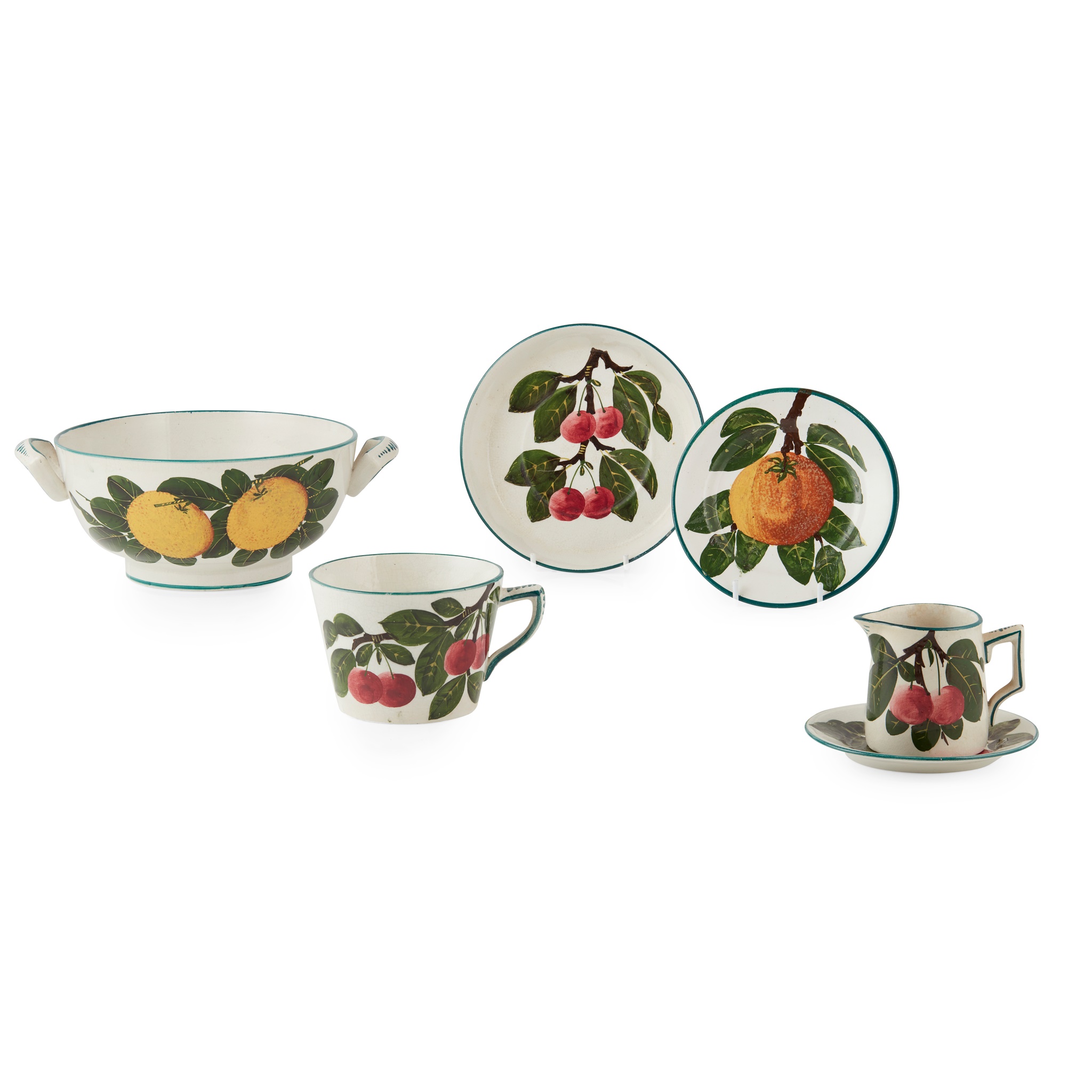 comprising a LARGE BREAKFAST CUP & SAUCER, impressed WEMYSS WARE/ R. H. & S., printed retailer's stamp T. GOODE & CO., saucer 15.7cm diameter, cup 10.4cm diameter; a MILK JUG, impressed and painted WEMYSS, printed retailer's stamp T. GOODE & CO., 6.7cm high; a SMALL PLATE, impressed WEMYSS, printed retailer's stamp T. GOODE & CO., 11.5cm diameter; together with an 'ORANGES' SPONGE BOWL, liner and cover lacking, impressed and painted WEMYSS, printed retailer's stamp T. GOODE & CO., 24cm across handles; and an 'ORANGES' BREAKFAST PLATE, impressed WEMYSS, printed retailer's stamp T. GOODE & CO., 13.5cm diameter