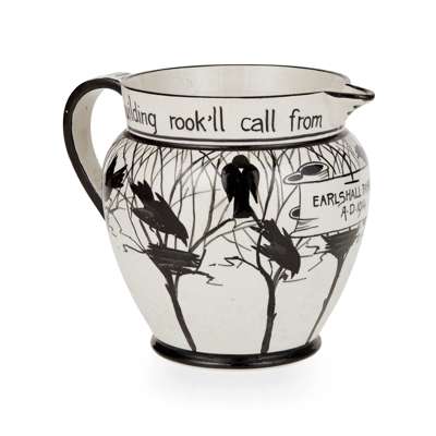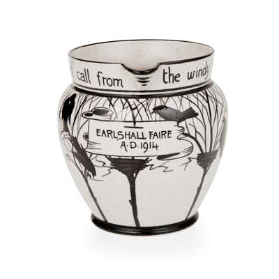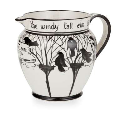 decorated with crows amongst branches, bearing inscription THE BUILDING ROOK'LL CALL FROM THE WINDY TALL ELM TREE./ EARLSHALL FAIRE/ A. D. 1914, impressed WEMYSS