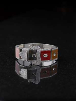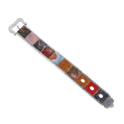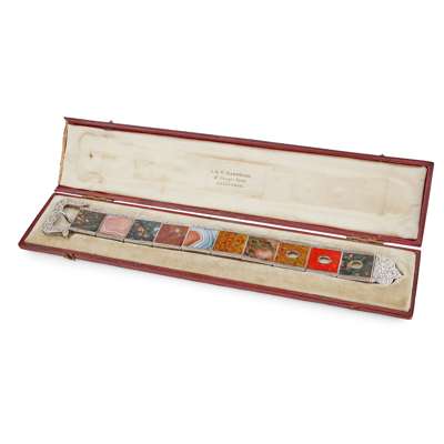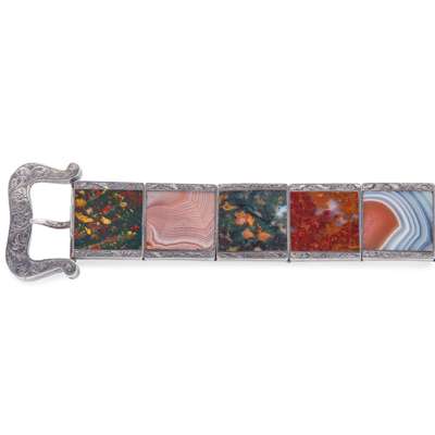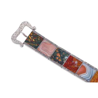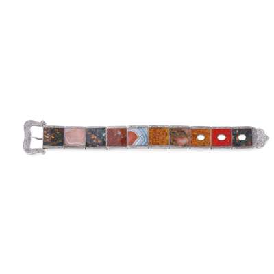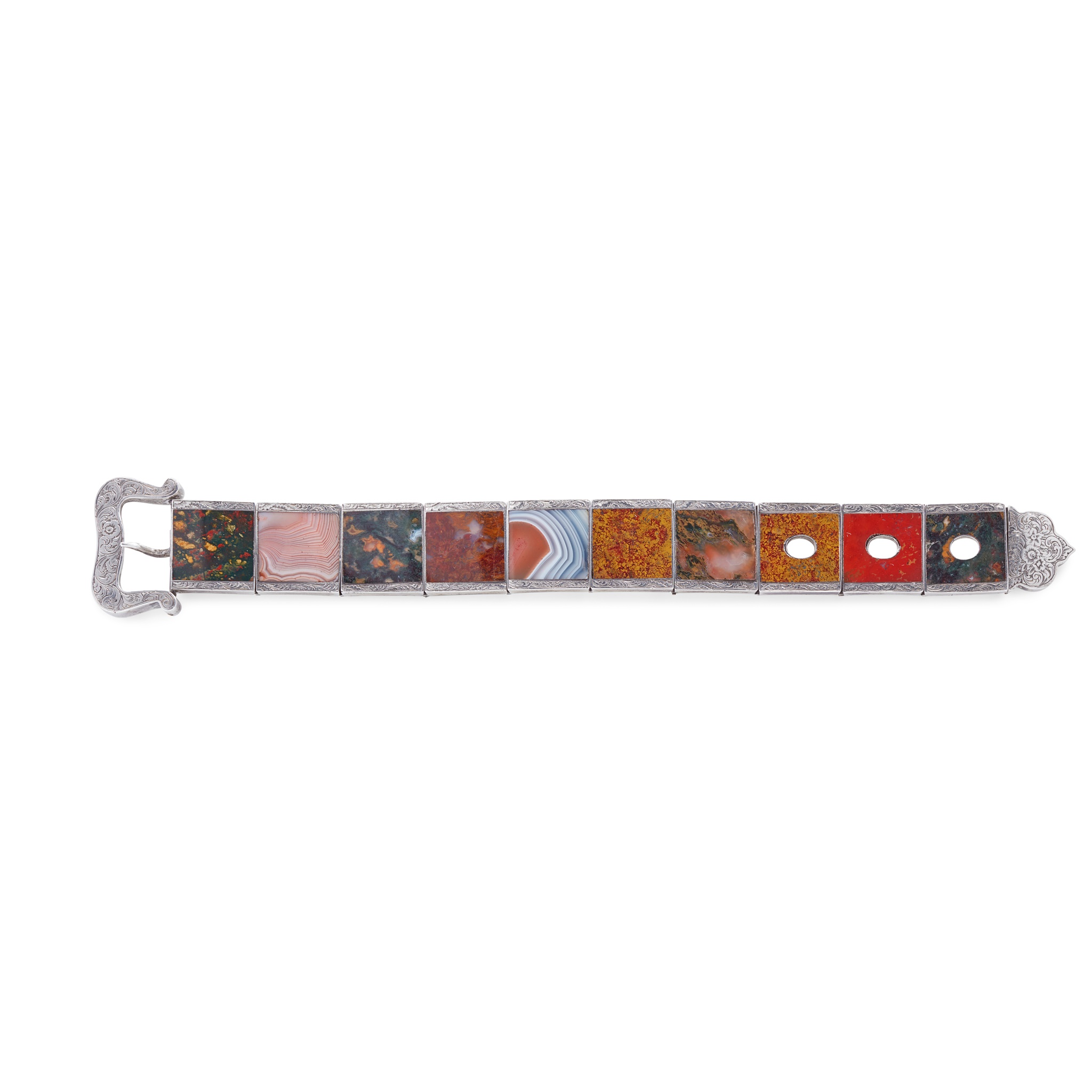 formed as a belt, comprising ten various agate panels of jasper, chalcedony, agate etc. to an engraved buckle clasp, presented in a fitted box, retailed by J & W. Marshall, 41 George Street, Edinburgh