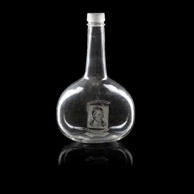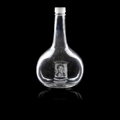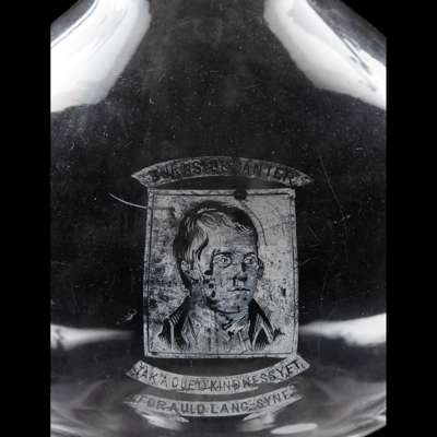 of shaft and globe form, with simple moulded neck, the bodies etched with a portrait of Robert Burns and motto within banner 'BURNS DECANTER TAK' A CUP O' KINDNESS YET FOR AULD LANG SYNE'