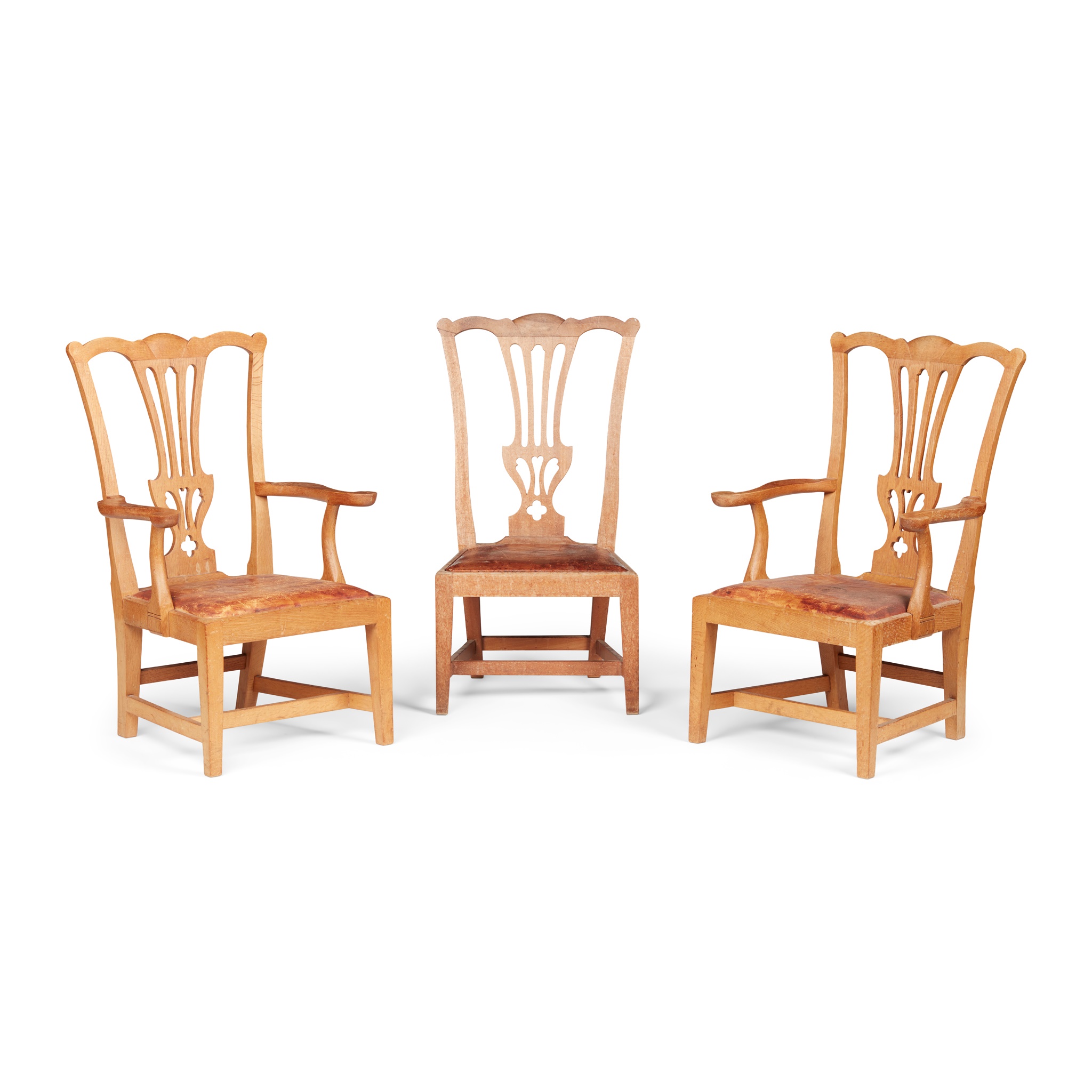 each with pierced splat back above drop-in leather seat and square legs, together with a similar side chair