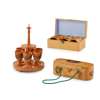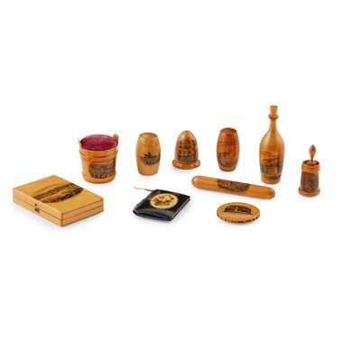 including an egg epergne, 24cm high; a sewing box, 19.5cm wide; a box with six napkin rings, 8cm wide; a needle box, with blue satin lined interior, 9cm wide; a bottle-shaped thimble holder with a metal thimble inside, 10cm high; a barrel-shaped thimble holder with a hallmarked silver thimble inside, 5cm high; a barrel-shaped needle holder, 4.5cm high; a luggie pin cushion and holder, 5cm high; a pin wheel, 4.5cm diameter; a measuring tape, 6cm high; a thread holder, 4.5cm high; a needle holder, 10cm long; all with transfer printed Scottish landmarks; and a needle folder with flower print, 6cm wide