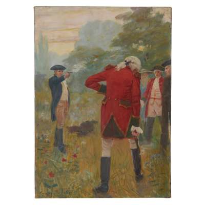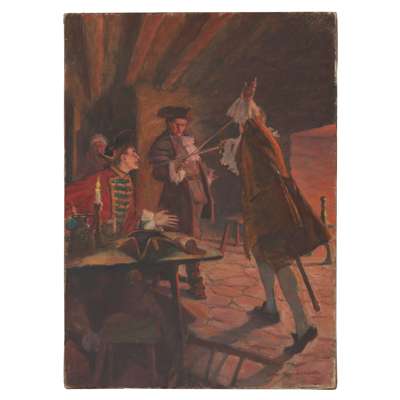 The Fight in Lucky Macleary’s kitchen [from Waverley], signed lower right; Hatteraick shoots Meg Merriliees [from Guy Mannering], signed lower right; The Dual between Lovel and Captain MacIntyre [from The Antiquary], signed lower left; Die Vernon and her father appear before Frank in the library [from Rob Roy], unsigned; all oil on canvas