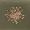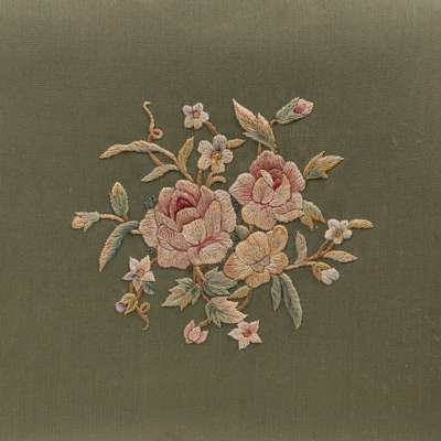 of typical form with a square lattice back and curved seat with a blue cushion with floral needlework cover