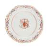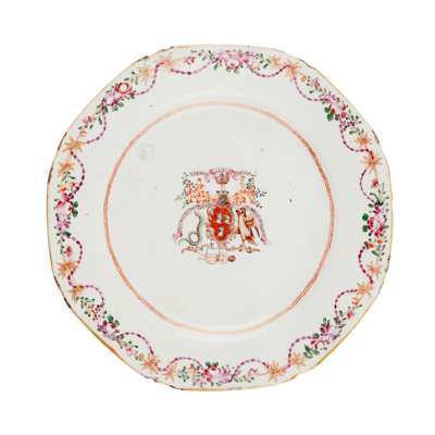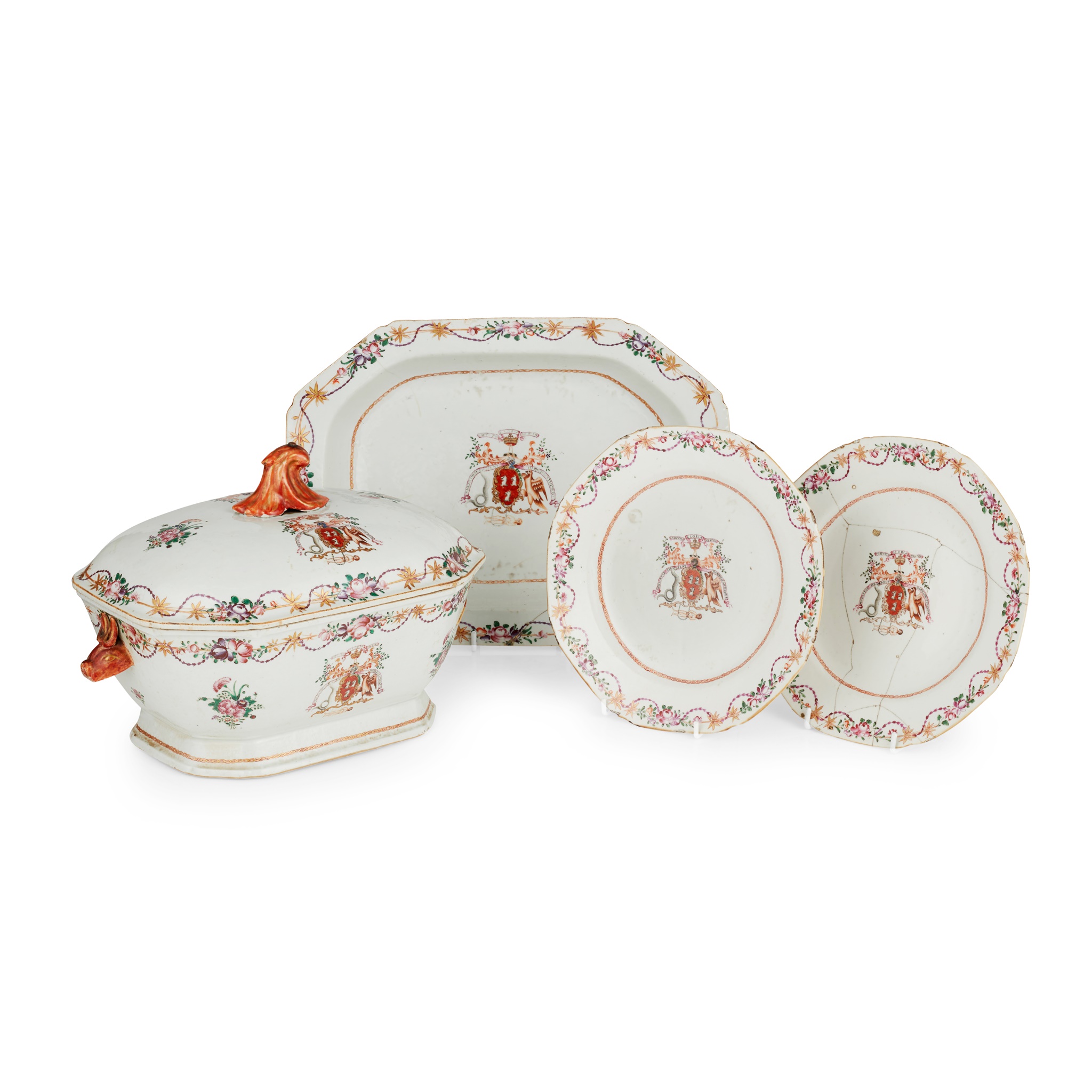 including one tureen with cover and stand (restored), two hexagonal plates (one restored, one chipped), all famille rose palette, with floral and interlinked borders, centres with full armorials for Robertson family