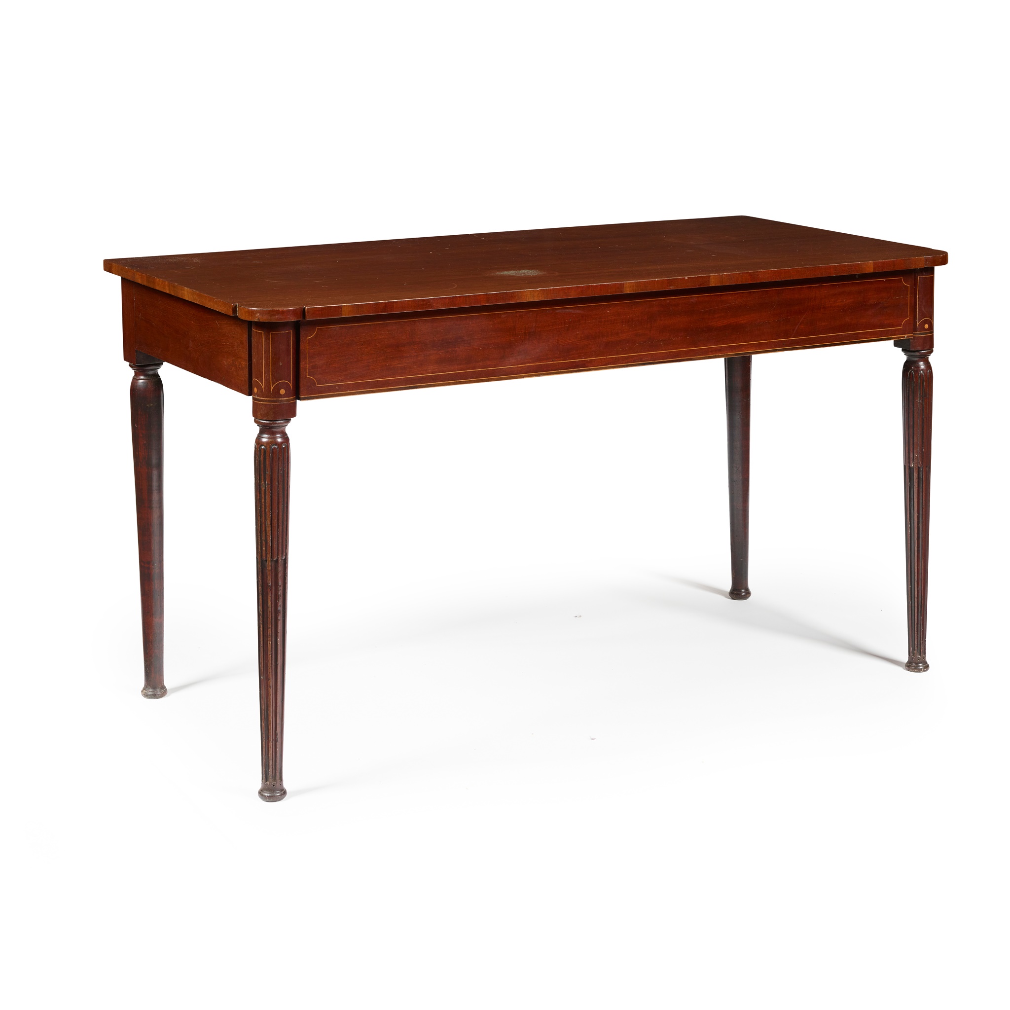the rectangular top with re-entrant rounded corners, above a line inlaid frieze raised on stop-fluted tapering legs headed by further line and dot inlay