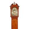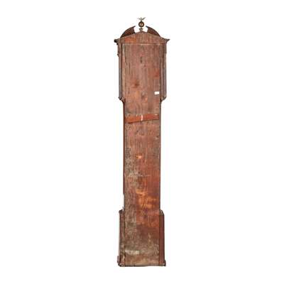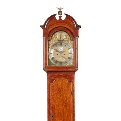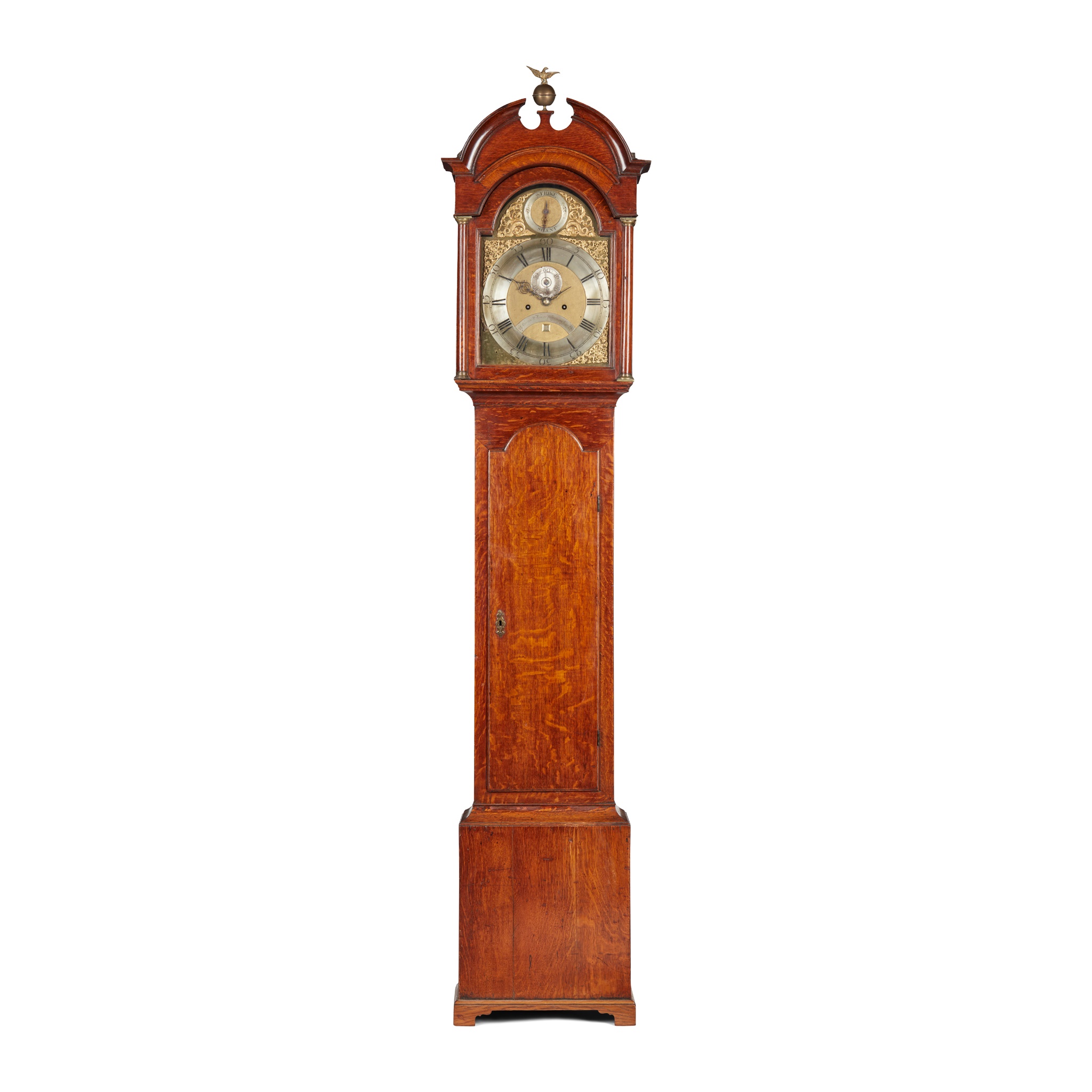 the arched brass dial with Roman chapters and subsidiary seconds dial, date aperture, and strike/silent dial to the arch, in an oak case, the hood with a broken arch pediment centred by a brass eagle finial and flanked by columns, above an arched trunk door on a plinth base with bracket feet, the twin-train eight-day movement with anchor escapement striking on a bell