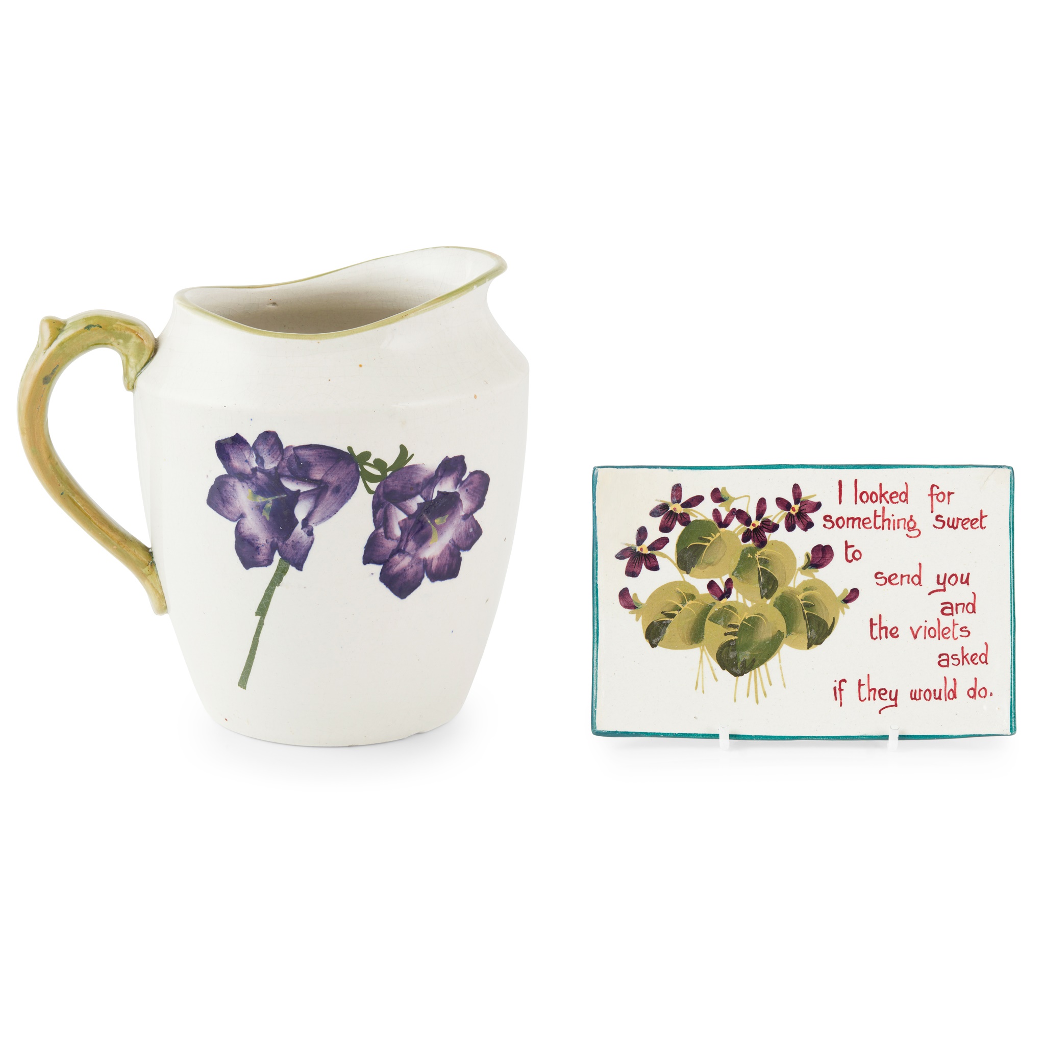inscribed I LOOKED/ FOR SOMETHING/ SWEET/ TO SEND YOU/ AND THE VIOLETS/ ASKED/ IF THEY WOULD DO., painted and impressed WEMYSS, 14.5cm across; together with a 'CANTERBURY BELLS' JUG, impressed WEMYSS, 16cm high