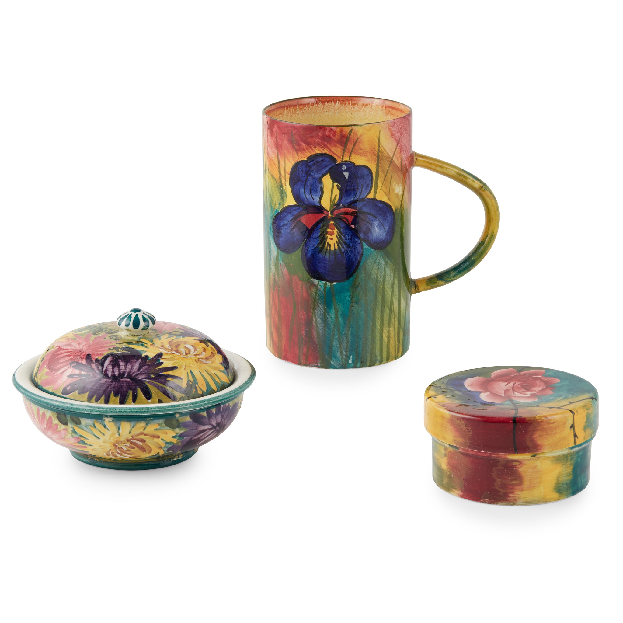 comprising a 'CHRYSANTHEMUM' SOAP DISH, LINER AND COVER, decorated by Edwin Sandland, painted and impressed WEMYSS, 14.5cm diameter; a 'JAZZY ROSES' LOW POMADE, decorated by Edwin Sandland, painted WEMYSS/ 213, 10cm diameter; and a 'JAZZY IRIS' TALL MUG, decorated by David Grinton, painted WEMYSS/ 213, 17cm high