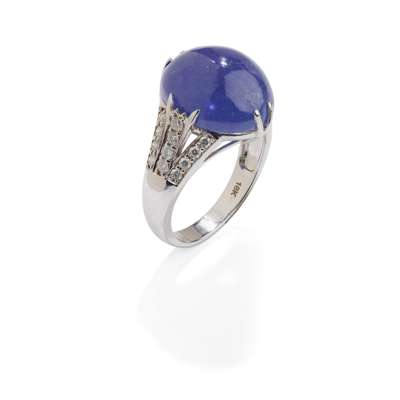 The oval cabochon tanzanite between brilliant-cut diamond trifurcated shoulders, mounted in 18ct white gold, UK hallmark