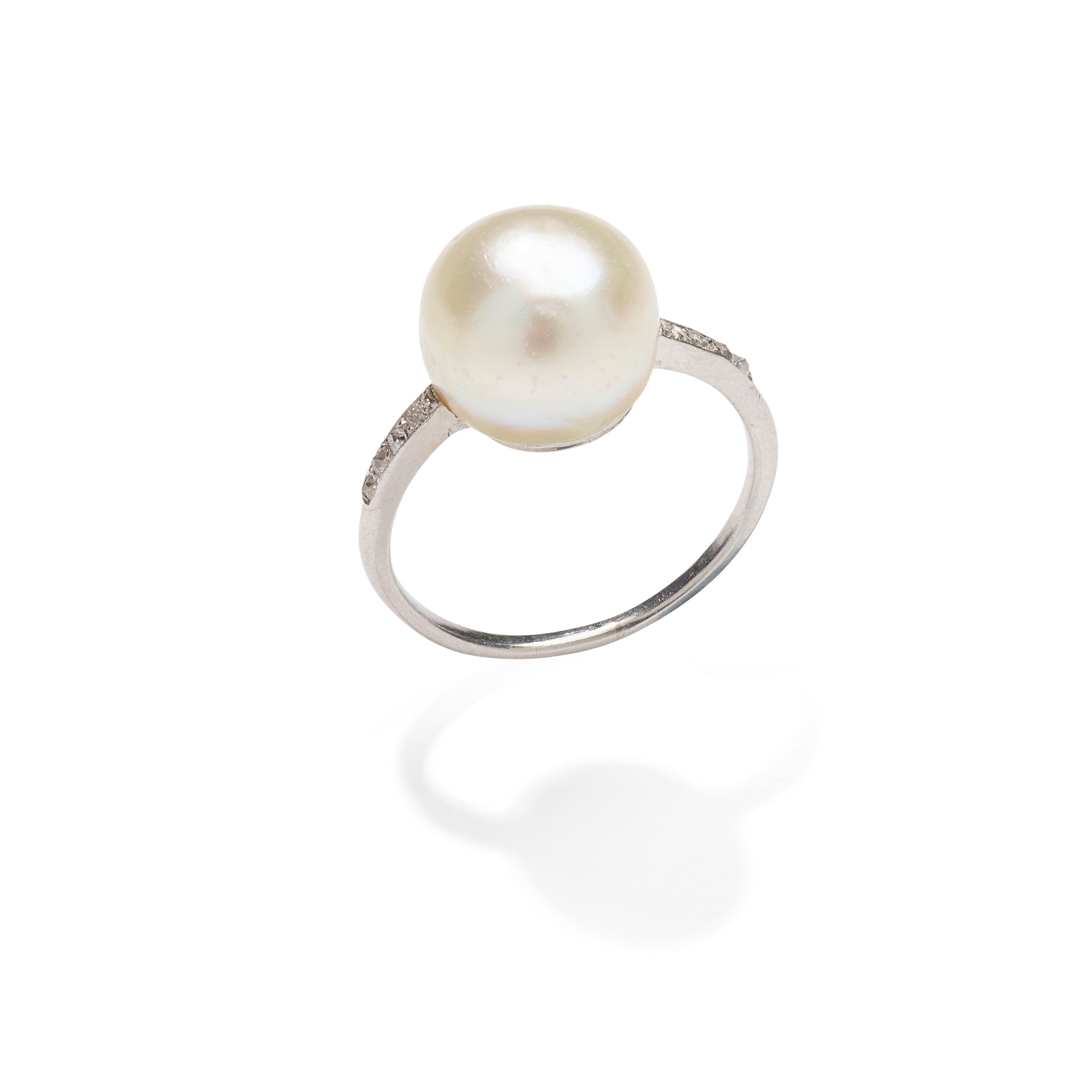 The 11.0mm pearl between millegrain-set old -cut diamond shoulders, pearl untested