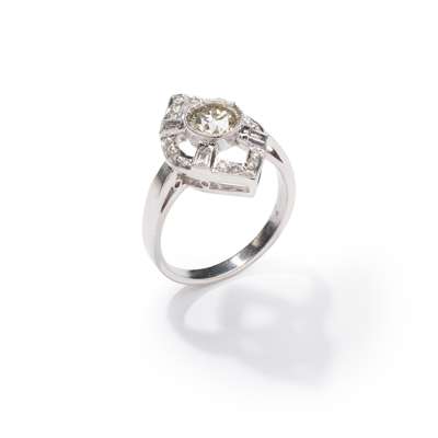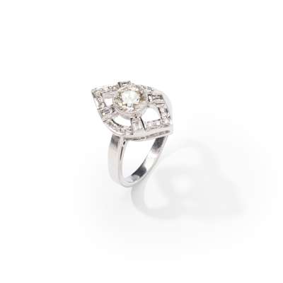 millegrain-set with an old brilliant-cut diamond within a navette-shaped openwork surround set with brilliant and baguette-cut diamonds, mounted in 18ct white gold