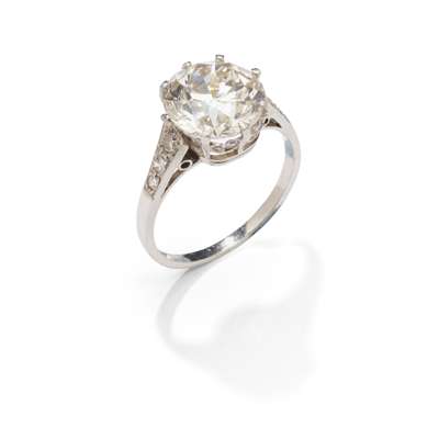 The old brilliant-cut diamond, weighing 4.03 carats, between tapered single-cut diamond three-stone shoulders, French assay marks