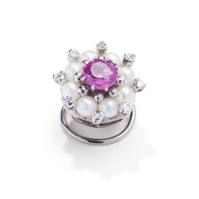 The circular-cut pink sapphire within a cultured pearl cluster surround accented with single-cut diamonds, to a twist pin fitting