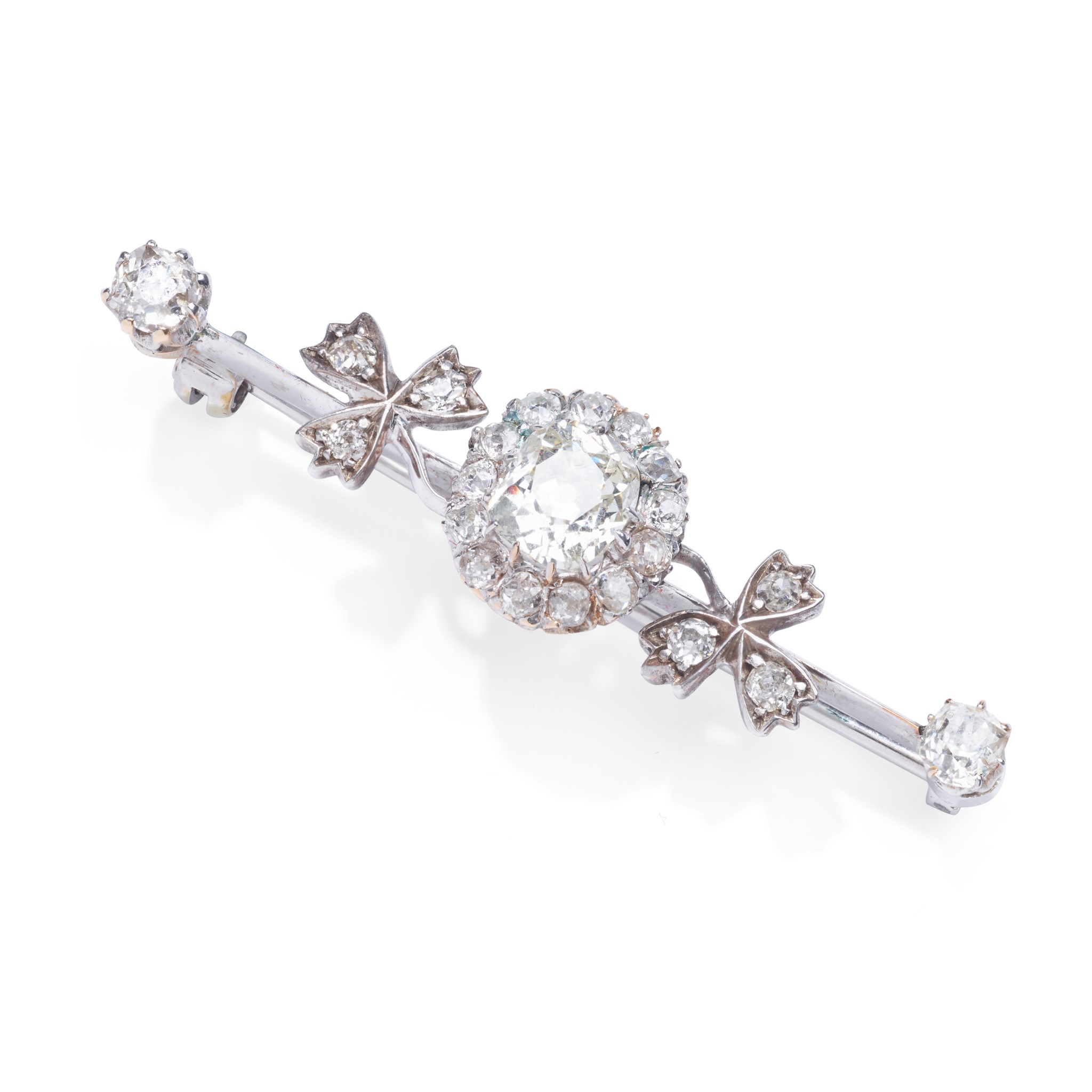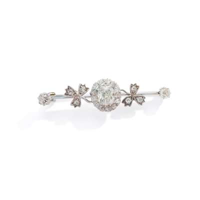 The old cushion-shaped and old brilliant-cut diamond cluster, between old-cut diamond trefoils and single-stone terminals