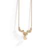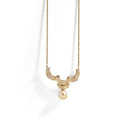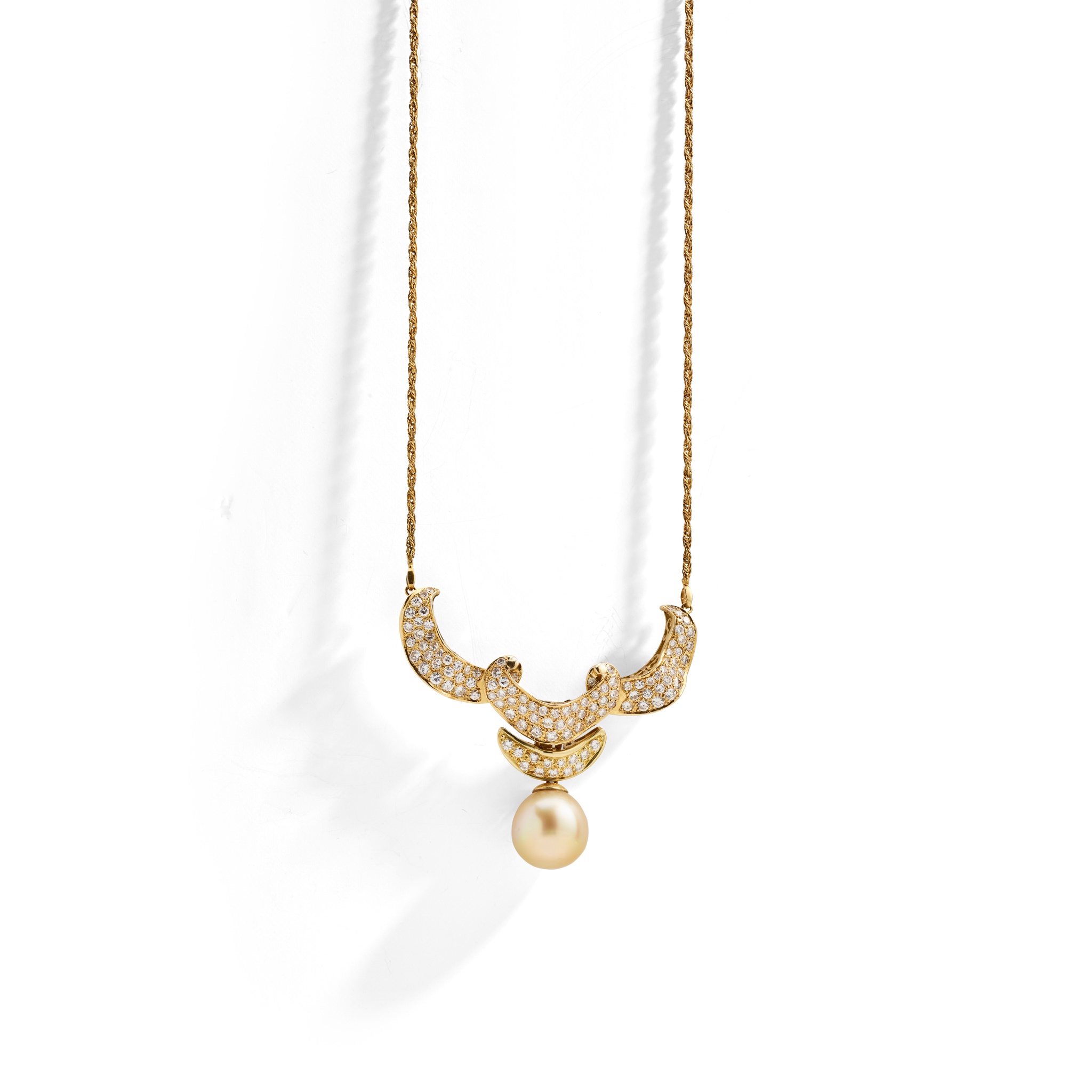 The 14.0mm cultured pearl of golden tint, suspended from a pavé-set brilliant-cut diamond curved panel surmount, to a fancy-link chain, pendant detachable