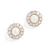 Each 9.5mm cultured pearl, within a brilliant-cut diamond surround, post fittings
