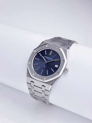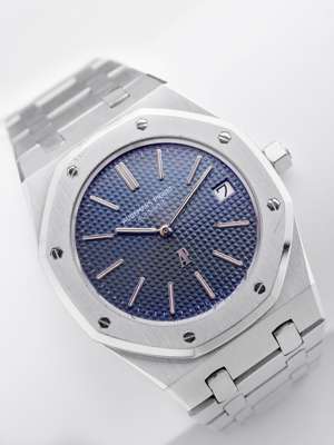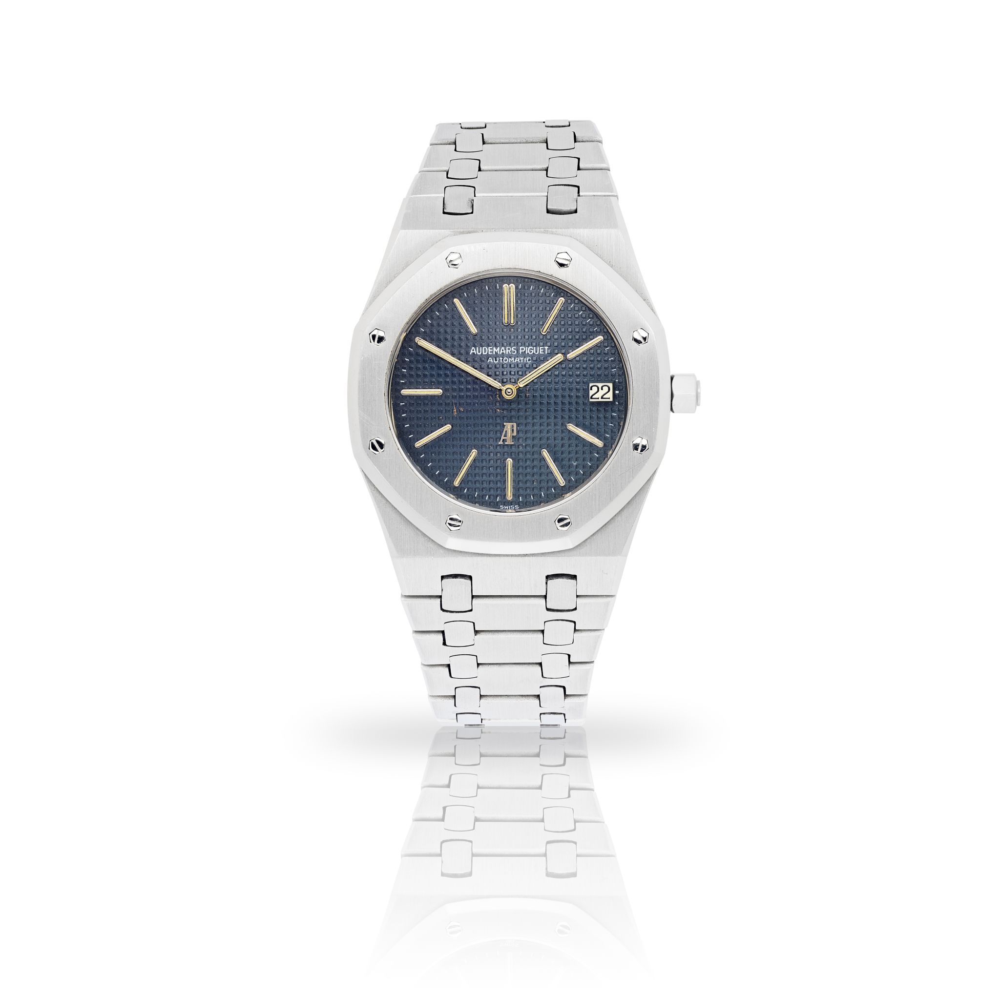 A-series model 5402ST, stainless steel case, automatic movement, c.1972, signed dark blue tapisserie dial with applied stainless steel baton hour markers with lume inserts, date aperture at 3, stainless steel pencil hands with lume inserts, octagonal bezel with screwheads, hexagonal crown with AP logo, the caseback with Royal Oak No. A 1485, on an integrated stainless steel bracelet strap formed by tapering flat bar links joined by smaller perpendicular rounded rectangular links, with a signed foldover clasp with BREVETE, AUDEMARS PIGUET & CO., SWISS STEEL, INOX SWISS MADE to the interior, no box and papers, with branded service-style cardboard box