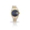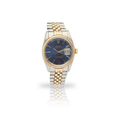 Oyster Perpetual Datejust model 1601, 1973 from serial number between lugs and on service paperwork, stainless steel case, signed Rolex calibre 1570 automatic movement, signed round blue dial with applied gold baton hour markers with lume plots beyond the terminals, date aperture at 3, outer sceconds track in gold, gold tapered hands with lume inserts, centre seconds hand also in gold, gold fluted bezel, screw-down crown with coronet, on a bi-colour Jubilee bracelet strap with 455 to the end links, signed Rolex foldover clasp with 62523H, A 14 to the interior, in box, no papers, with additional bracelet link and swing tag, with partial service paperwork