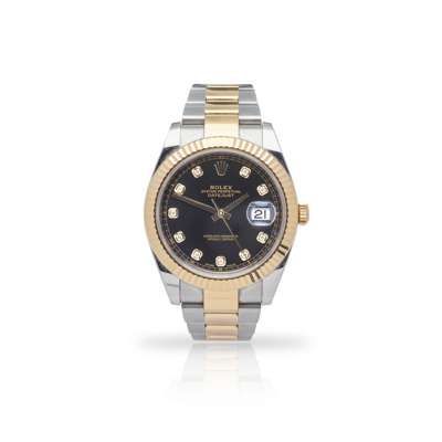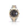 Oyster Perpetual Datejust model 126333, stainless steel case, signed Rolex calibre 3235 automatic movement, c.2011-22 from serial number, round black dial with gold-bordered diamond dot hour markers, date aperture at 3, gold hands, central seconds hand, outer seconds track in gold, gold fluted bezel, screw-down crown with coronet, on a bi-colour Oyster bracelet strap with signed Rolex Oysterlock clasp with 72613 to the interior of the end link, no box and papers
