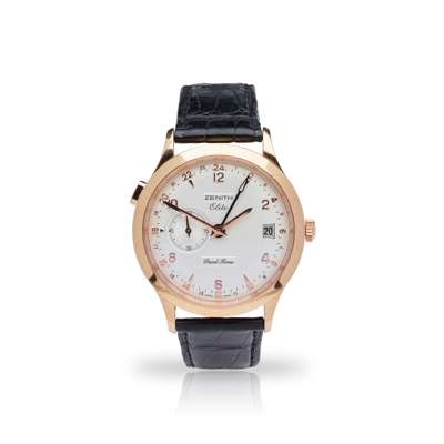 Elite Dual Time model 18.112.682, rose-coloured case marked 750 18K, signed Zenith automatic movement, 2008 from guarantee card, round white dial with applied rose-coloured Arabic numerals, date aperture at 3, sunken small seconds at 9, outer 24 hour track, rose-coloured pencil hands, silver-coloured pointer with skeleton arrow terminal, exhibition caseback with model number to the edge, on a signed Zenith strap with signed Zenith deployant clasp marked 750, in box, with warranty card, with swing tag and booklet
