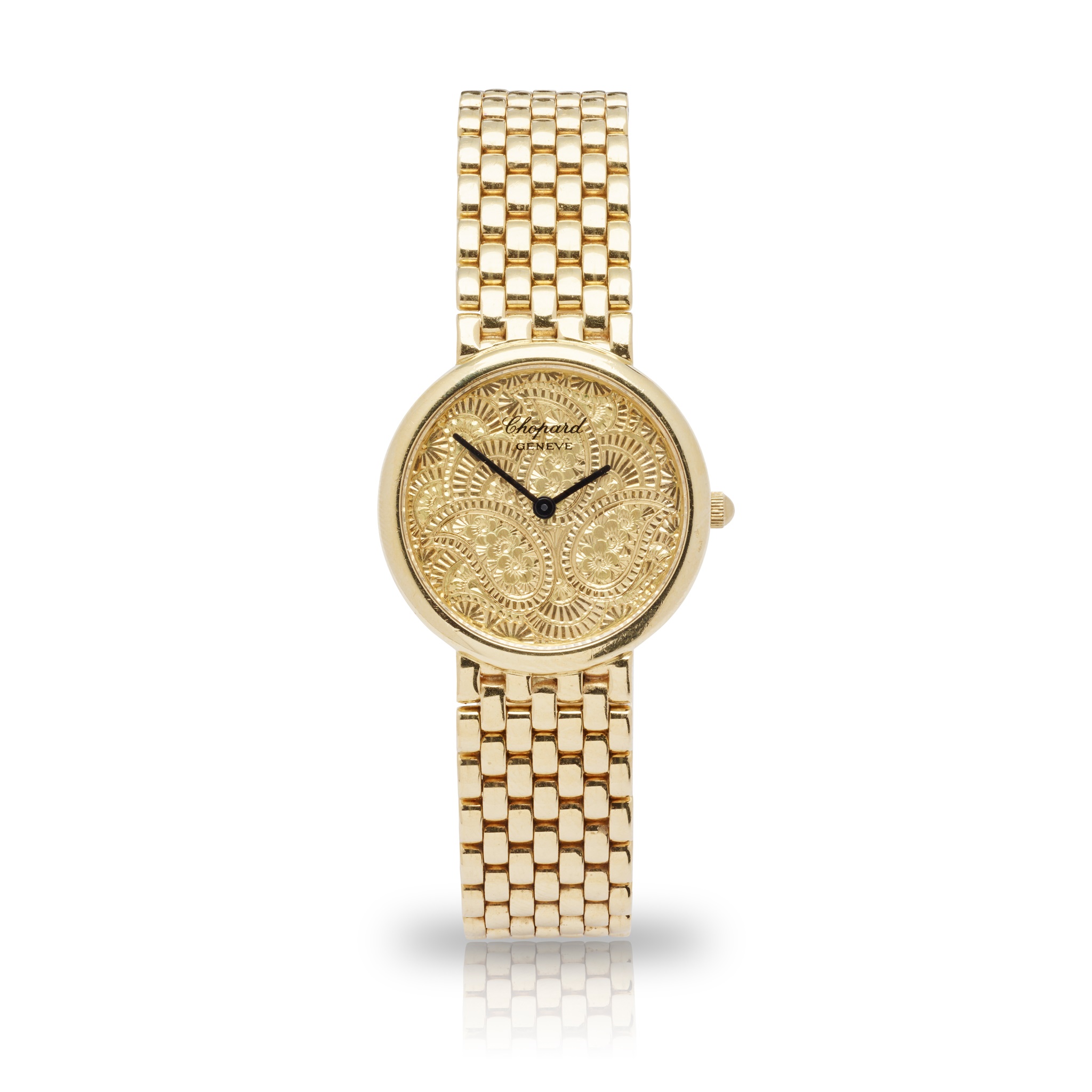 Casmir model, quartz movement, round engraved dial with Paisley or boteh pattern, no numerals, black pencil hands, the crystal signed Chopard GENEVE, with 43/7311, 335642, 4136 1 to the caseback, on an integrated bracelet strap with signed Chopard clasp marked 750, no box and papers