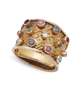 The wide tapering band pierced with scroll motifs, collet-set with circular-cut sapphires, diamonds, emeralds and turquoise, two stones deficient