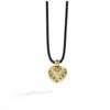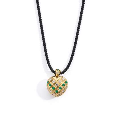 The heart-shaped bombé 18ct gold pendant set with circular-cut emeralds and brilliant-cut diamonds in square mounts, suspended from an 18ct blackened gold ropetwist chain, UK hallmarks