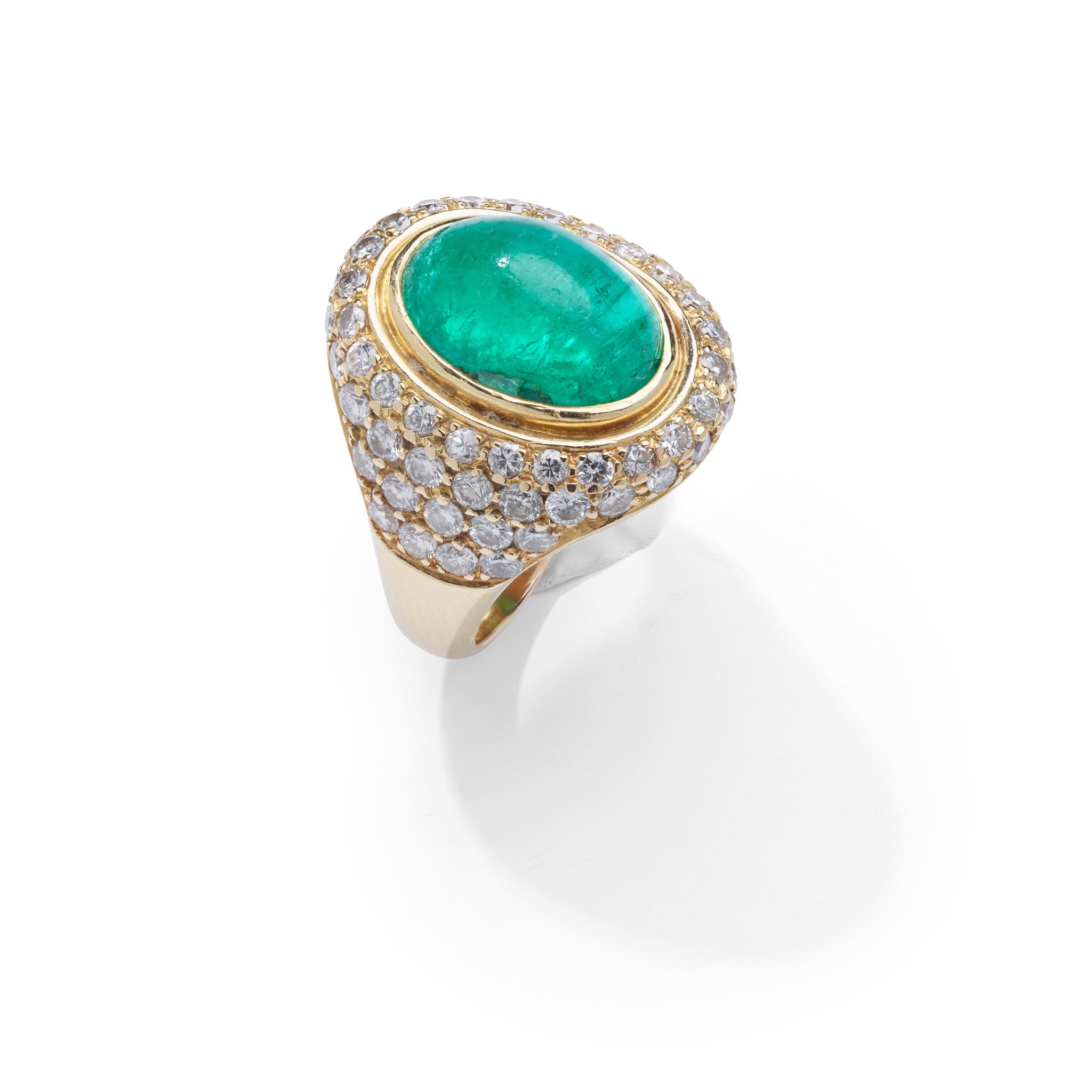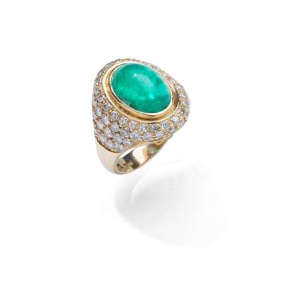 Collet-set with an oval cabochon emerald within a pavé-set brilliant-cut diamond surround, mounted in 18ct gold, Swedish assay marks, maker's mark WAB