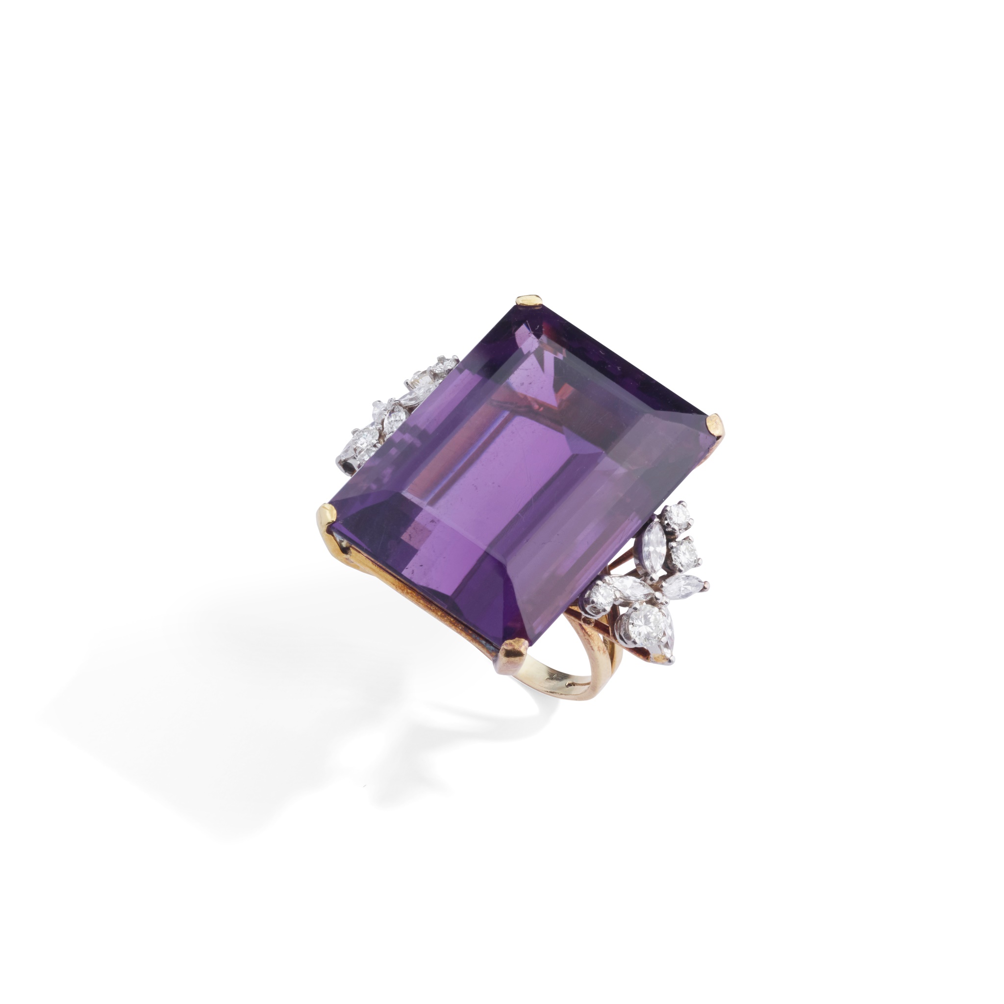 The cut-cornered rectangular-cut amethyst, between brilliant and marquise-cut diamond cluster shoulders, to a bifurcated band