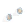 Each oval cabochon opal, within a brilliant-cut diamond surround and openwork kite-shaped blue topaz frame, post fittings