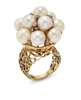 Designed as a cluster of cultured pearls interspersed with single-cut diamond points, to a crown and hoop of openwork tubular 18ct gold design, maker's mark, UK hallmark