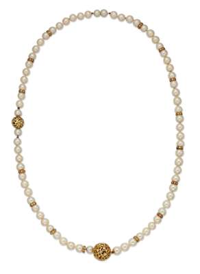 The single row of 8.80-9.55mm cultured pearls interspersed with diamond-set rondelles and two openwork beads accented with brilliant-cut diamonds, divides into a necklace and two bracelets, or two necklaces, three diamonds deficient