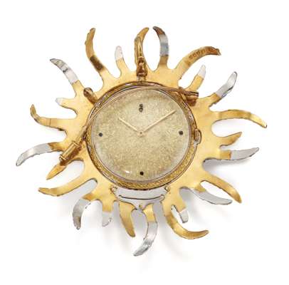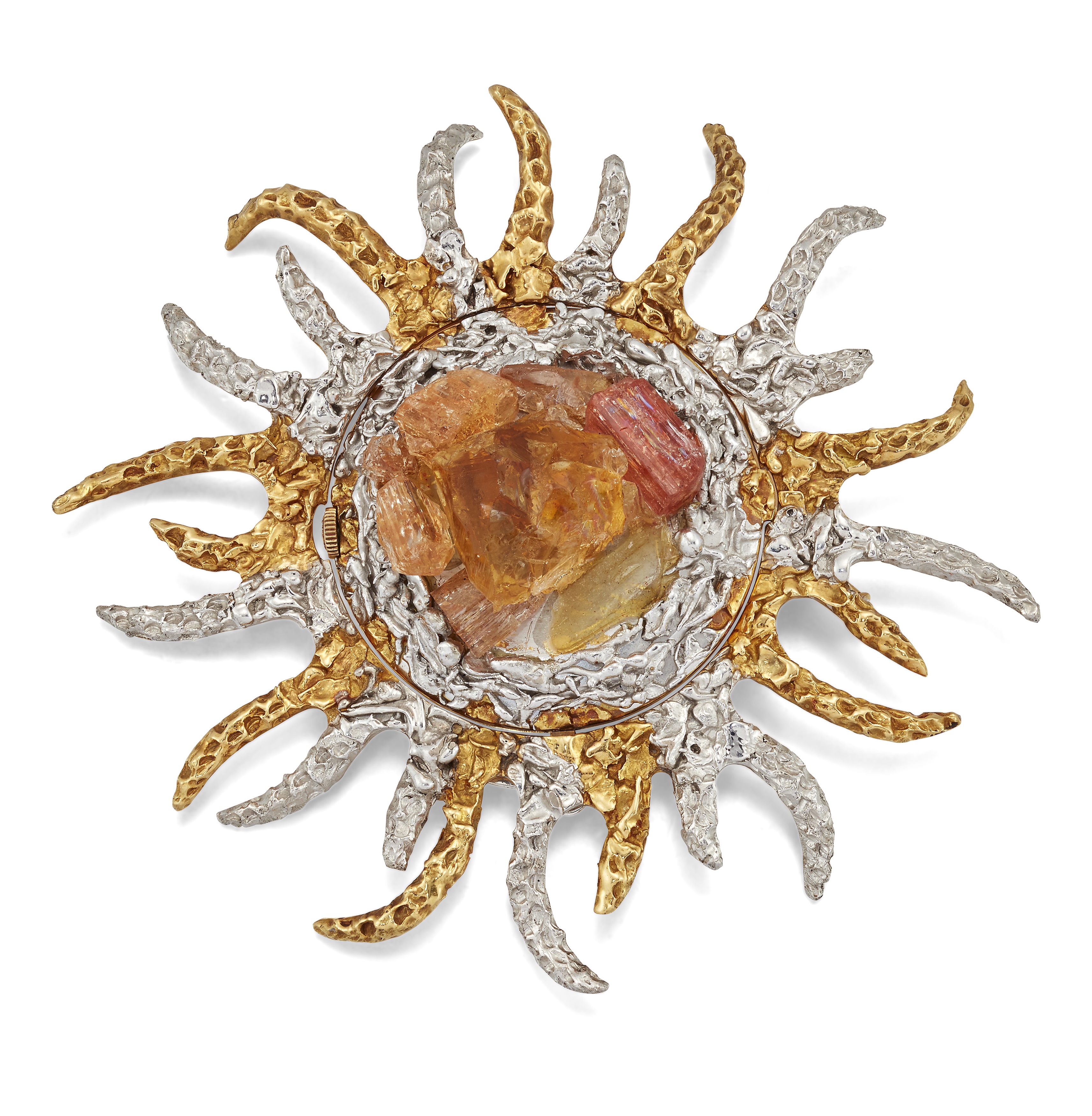 The swivel centre set to the front with a cluster of topaz crystals, the reverse with a circular dial with dot quarters, within a textured 18ct bi-coloured gold tendril surround of hammered finish, one topaz crystal deficient, maker's marks, UK hallmark