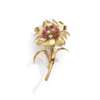 Set with a cluster of brilliant-cut diamonds and circular cabochon rubies, within a textured 18ct gold petal surround, to a polished stem and leaves, maker's mark, UK hallmark HJ&Co