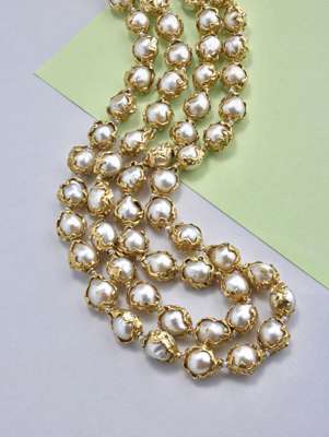 Composed of two rows of baroque cultured pearls, each within a textured 18ct gold cage setting, to a textured clasp accented by two half pearls, maker's mark CdeT, London hallmark