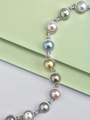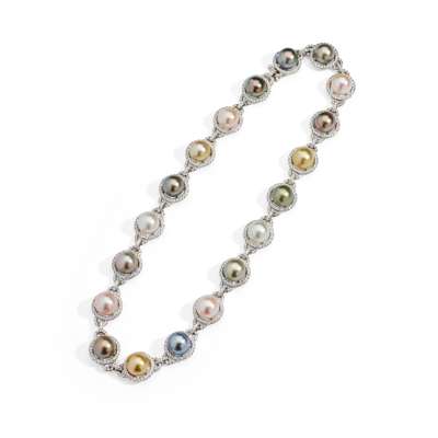 Designed as a continuous row of 10.0-10.5mm cultured pearls of various cream, grey, golden and brown tints, each to a brilliant-cut diamond halo surround and connecting link