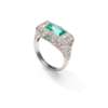 The rectangular step-cut emerald, between square-cut diamond shoulders, within a pavé-set old brilliant-cut diamond surround, with pierced motifs and triangular-cut emerald accents