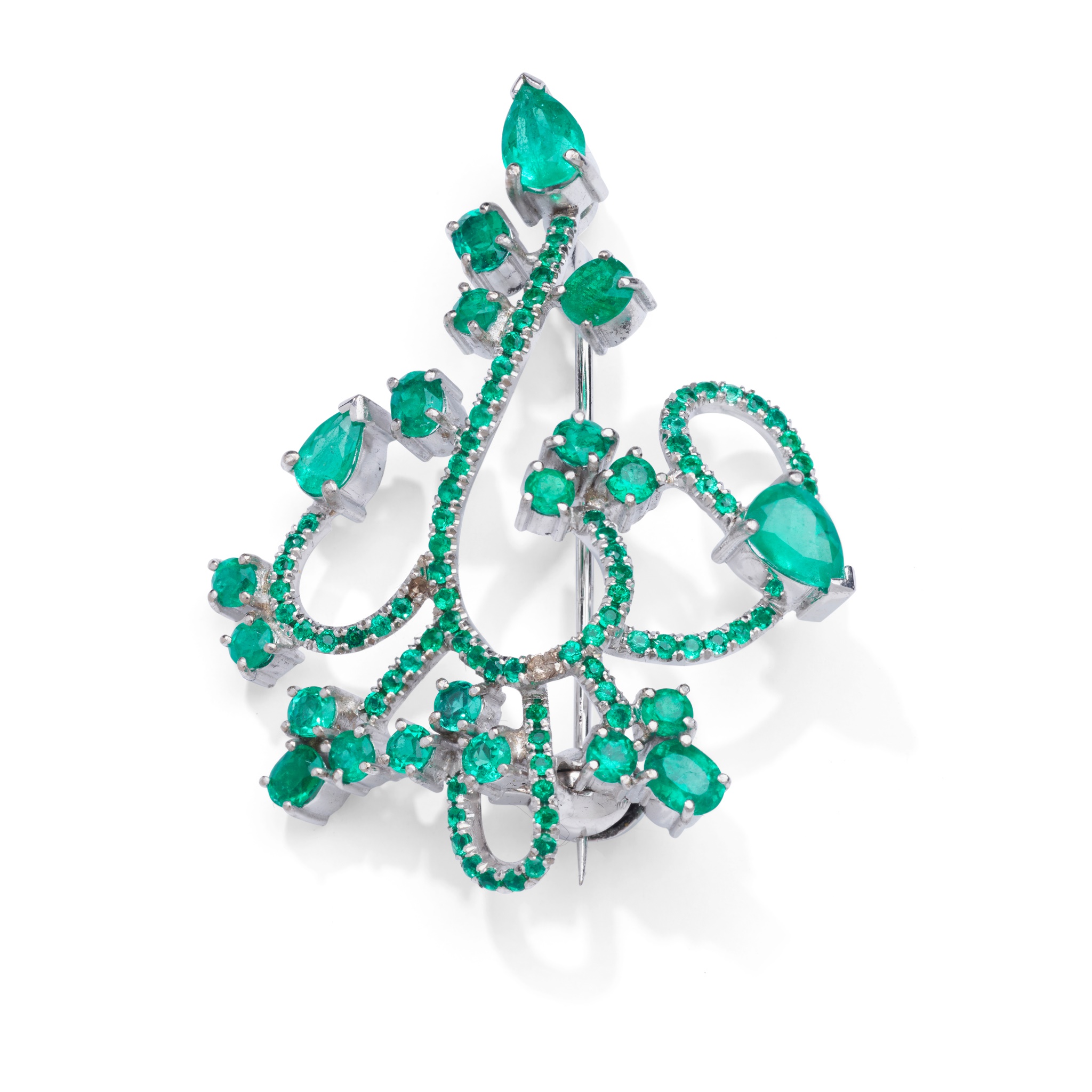 Of openwork design, set with scrolled lines of circular-cut emeralds, highlighted with pear-shaped, oval and circular-cut emeralds, pendant loop and pin fitting