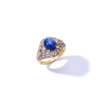 The oval cabochon sapphire within a pierced domed surround, set with brilliant-cut diamonds, one diamond deficient