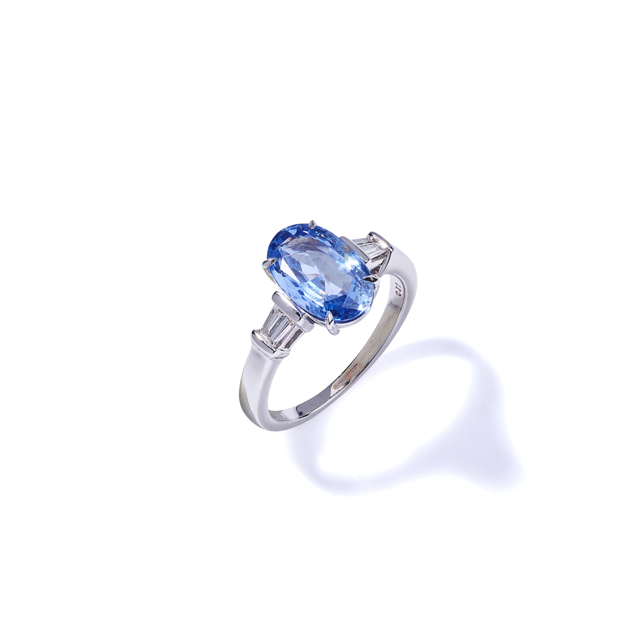 The oval-cut sapphire, weighing 3.14ct, between tapered baguette-cut diamond two-stone shoulders, mounted in 18ct white gold, UK hallmark