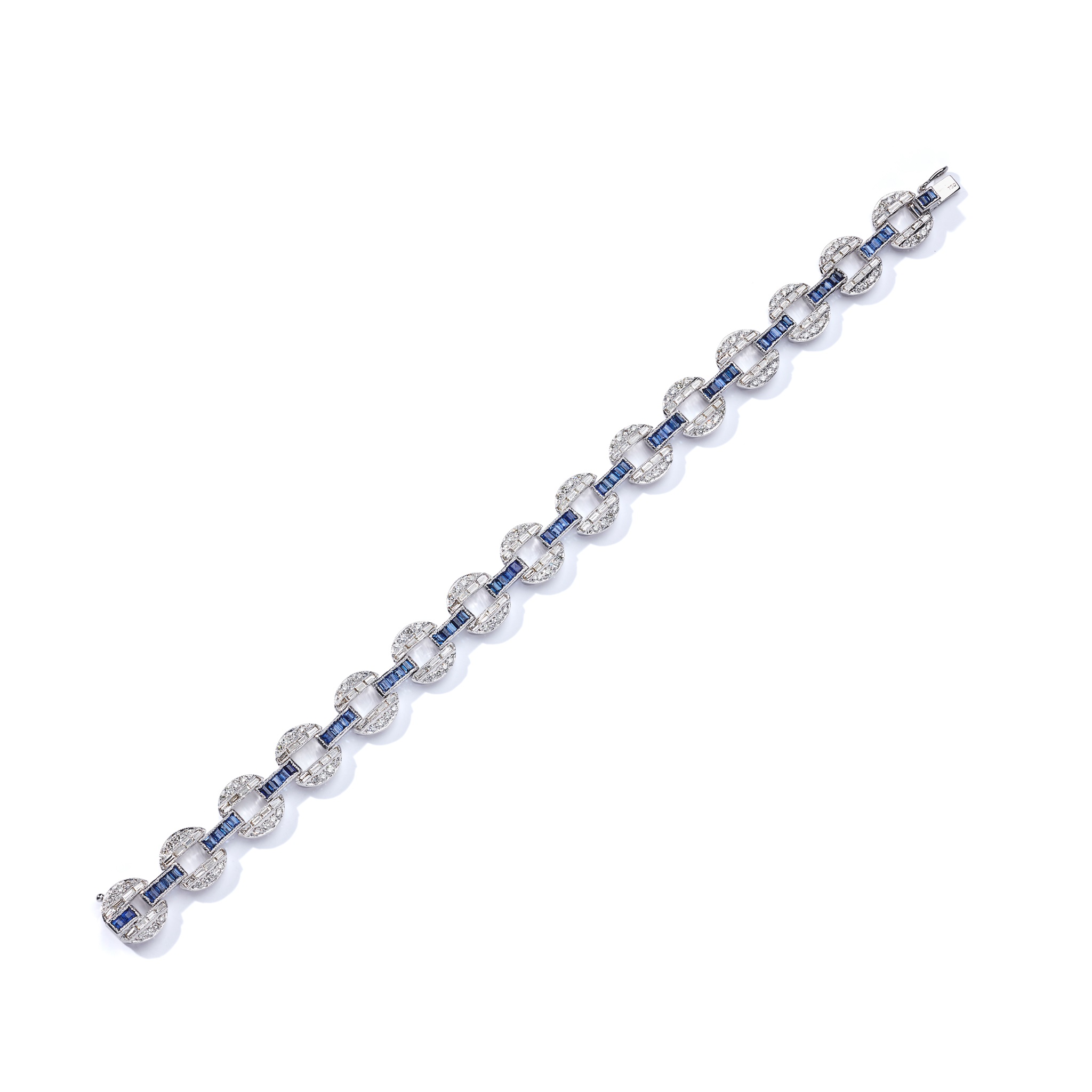 Designed as a series of opposing half-moon links set with brilliant and baguette-cut diamonds, and calibré-cut sapphire line sections