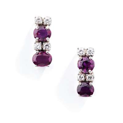 Composed of two oval-cut rubies alternating with brilliant-cut diamond duos, post fittings
